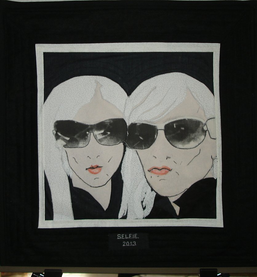 Judyc Selfie 2013 - This quilt was inspired by a self-photo taken by my daughter in law, Beth Leathers. She and her friend were striking poses while trying on designer sunglasses.