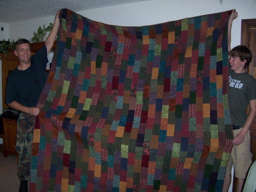 Nubbins Bennys Flannel Brick Road to Home - Pieced and Quilted July 2007 in Boise, Idaho Made for: Benjamin Henshaw Seymour Johnson AFB, North Carolina USA before leaving to serve his country in Afghanistan Aug 2007- Jan 2008 Ben and his son Stefan are in the picture. He took this quilt with him to help keep him warm. This was my first long arm quilt.