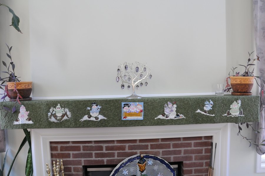 ackuchcik Happy Snowmen - This was the very first quilted fireplace mantle cover I made for my daughter as a Christmas gift. Since then she has requested all four season of which she now has spring, fall and winter. The last request was for a summer one. I first painted the fabric with acrylic paint and a textile medium and then quilted it. The winter one has snowmen in different positions from skiing, snowballs, and just plain having fun.