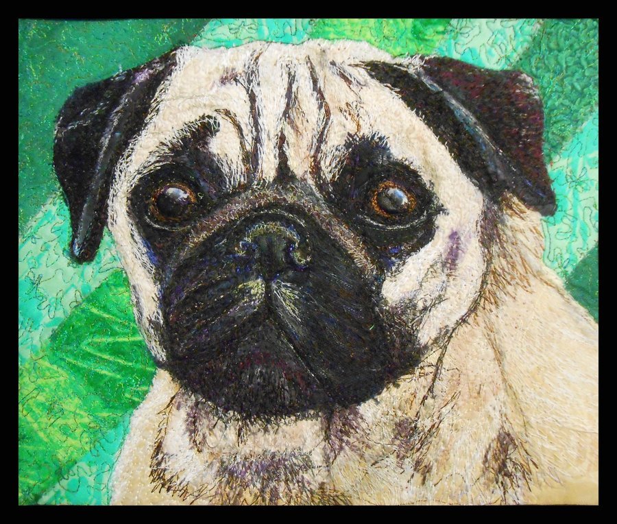 | Design Source - Description | I sketched this dog on canvas and then glue basted lots small snippets of fabric. Everything was quilted with invisible thread. Finally I thread sketch for realism and texture. |