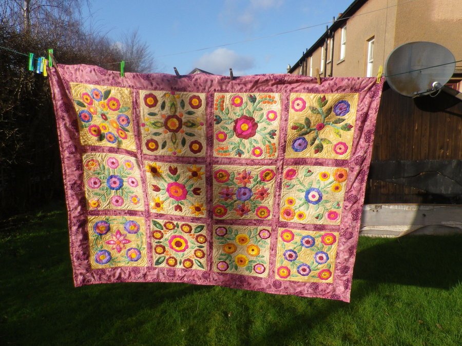 mc555 Winter Flowers - Used the book for inspiration, adapted a lot when sewing as I did not plan, just picked up materials and followed blocks as far as possible. First time I tried quilt as you go. Ran out of background fabric to make a decent border. Enjoyed using Sharon Pederson's book and keeping busy over the Winter