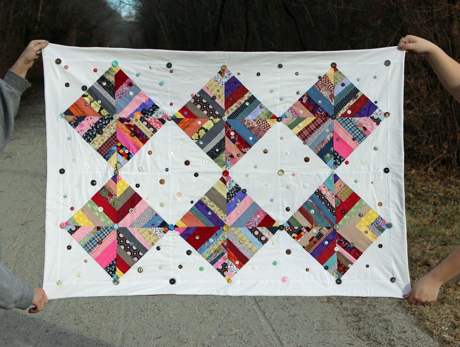 Stephanie84 Buttons and Strings - This is a string quilt that also incorporates solid blocks to emphasize the Splash of color from the String blocks. It measures 34 X 50 and is 'quilted' with hand sewn buttons throughout. Currently for sale in my Etsy store 'Katy Trail Creations'.