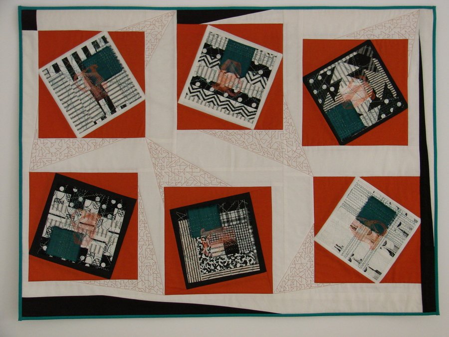 Marianne-is-sewing Juggling Jugs - My first wall quilt. Black and white blocks result of playing with Vasarely sequence strips. The jugs are digitised using drawings I did for a still life design class and ME. My first attempt at FMQ. Very much a sample quilt