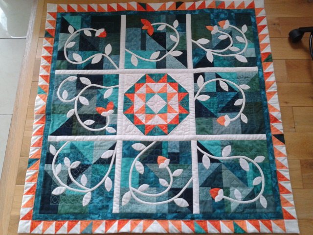 Marianne-is-sewing Tredegar House - At the end of a workshop I had 8 green blocks that I did not greatly care for due to lack of value but saw a possibility of using them by adding appliqué. The centre block was constructed because I felt I needed 9 blocks and I did not have enough greens left to make one more block. I decided to treat this as a appliqué sampler and I ended trying out 11 different ways of creating edge turned appliqué to figure out what I liked and didn't like. TQS shows were a great help to identify different techniques. I now know without doubt what to do next time! I also tried out several sashiko style background quilting patterns.