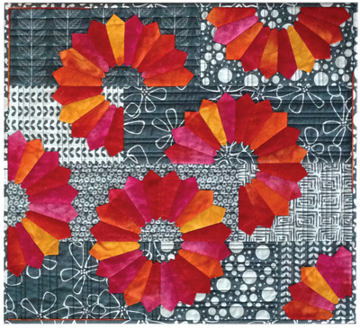 pipinghot Double-pointed Dresden Quarters - This contemporary spin on a traditional favorite is easier by eliminating the need for an applique center. Dresden points are 3D and both ends of each wedge is pointed! As another twist, I simply basted the Dresden units in place until the quilt is layered, then stitched in place during quilting. I quilted in the ditch between blades, flipped up a point, travelled to the next ditch, and so on. It worked beautifully!