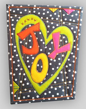 pipinghot Joy In My Heart - I blanket stitched by machine with a stitch width and length of about 2.5mm. This piece features WonderFil Spagetti 12wt (heavy) cotton thread in several bright colors. It was used for applique, for outline quilting, for background quilting, and for prairie point embellishment. Of course, I included piping in the binding and wacky silhouette.