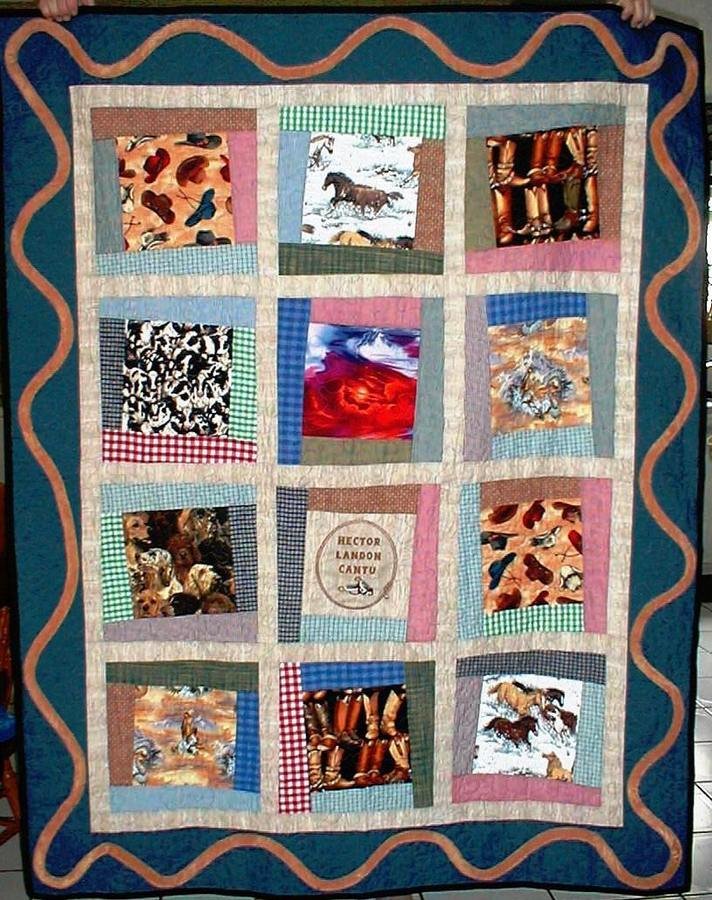 | Design Source - Description | Custom made for this little cowboy, using plaid fabrics around the wonky squares of western fussy cut prints. The rope around the border is made from fleece and i machine appliqued on. |