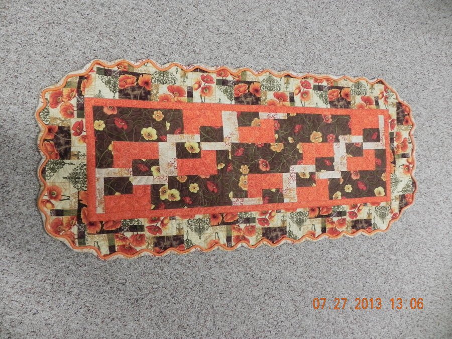 DoodleNsew Poppy - This is a Table Quilt. I put a ripple piping and binding to emulate the delicate poppy flowers. My Mom loves the color orange so this one is for her. This was sewn on my Bernina Artista and I quilted it with my Handi Quilter longarm using Gold metallic thread.