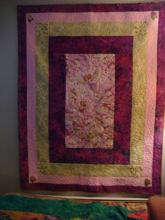 Blaze Pixie Dust - This quilt was made for my Niece who lives in California. I used Trapunto in the middle to accentuate the pixies and some flowers. It is heavily quilted with feathers, bubbles and leaves.