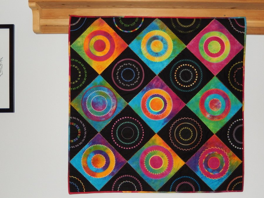 HappyQuilterWyo Thank You Libby - The best class I've ever taken was taught by Libby Lehman in which she taught us the ins and outs of making circles. Since that time I've been thinking about making a quilt like this tho I never found my roundtuit to design one so when I saw this kit I knew I had found the answer -- Libby's great design and Ricky's wonderful fabrics made this a fun quilt to make -- I got to decide which fabrics to put where and which fancy stitches to use so it is uniquely mine. THANKS LIBBY! AND RICKY!