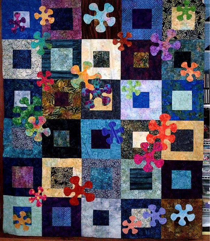 stephensfrog Splat - This quilt needed a little push to make it come alive. I chose to add splats of colour that I remembered were a great style builder from taking a class with Libby. There are lots of splats with thread play also.