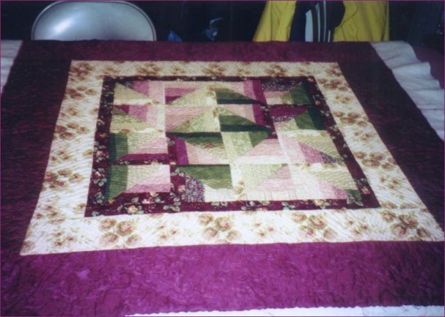 QuiltBob Traveling Geese - This small quilt was made with left over block from a larger quilt and the small quilt was given to a family that hosted my wife and I on a visit to Germany with the High School orchestra that I direct. The mother was thrilled and it matched her decor perfectly! i actually finished hand stitching the binding as we drove to the airport.