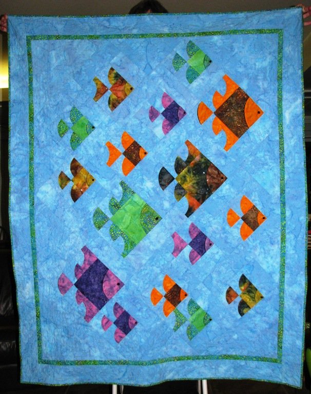 | Design Source - Description | 3D tropical fish swiming in the deep blue sea. 100% cotton batiks and prints. Machine pieced, hand appliqued, machine quilted. |