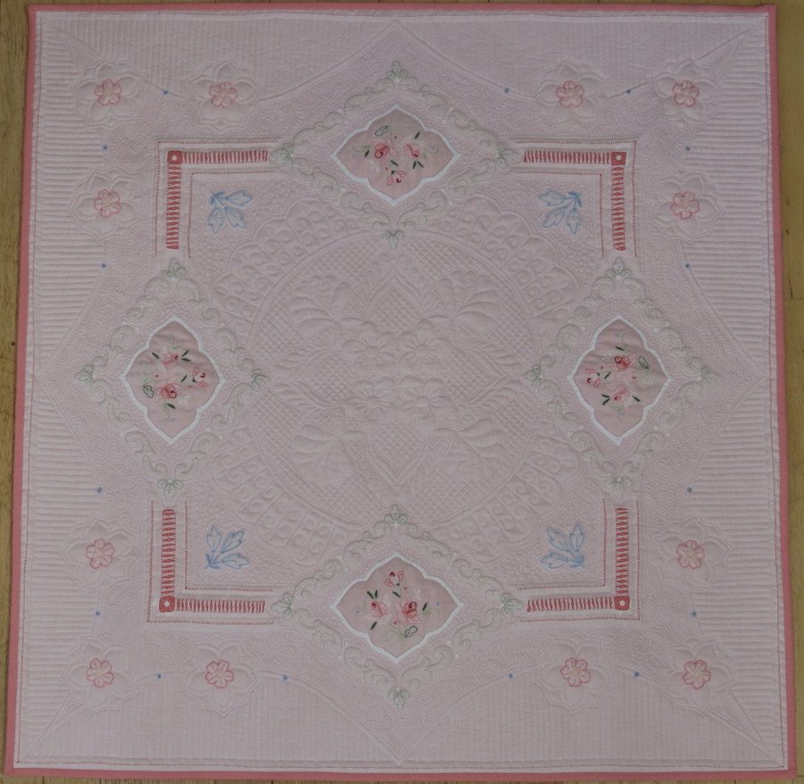 rehak Tea for Two - Inspired by Cindy Needham, I took my mother's old tablecloth and made it into a quilt. When I was very little, my father used to sing "Tea for Two" and dance the old soft shoe, so I thought that was a appropriate title. I'm very happy with how this turned out!