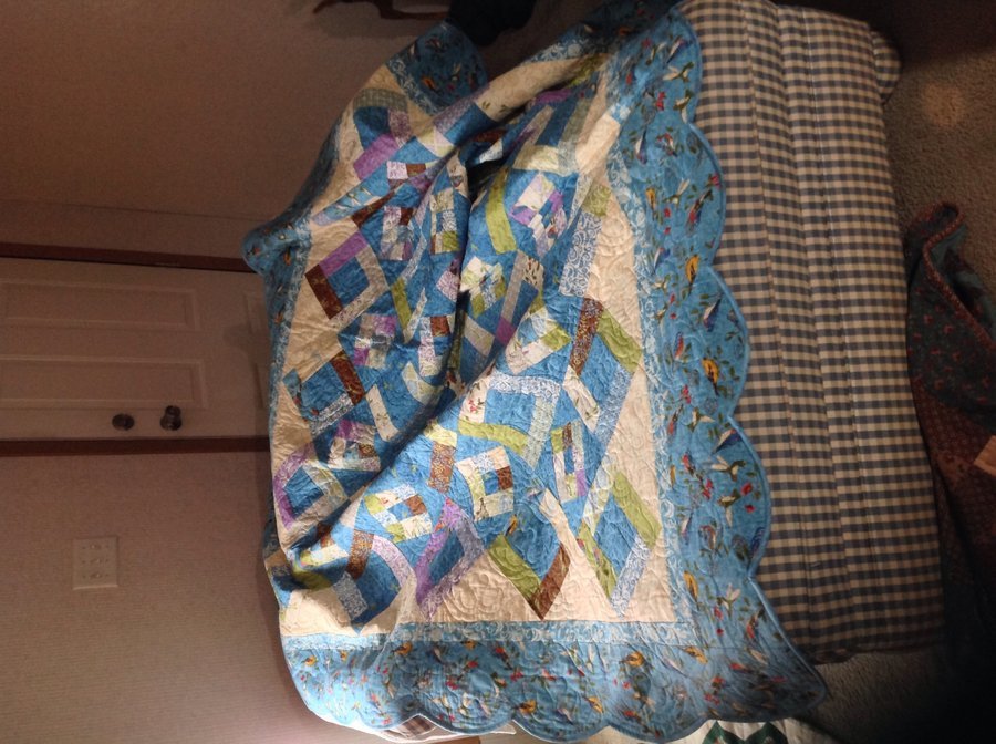 Cntryfawn883 Bluebirds - My granddaughter wanted a blue quilt for her bed. They live in Germany and the beds are a different size than ours in the states, so this was adapted to fit her bed. It is made from a jelly roll with added bird fabric and has a scalloped border.