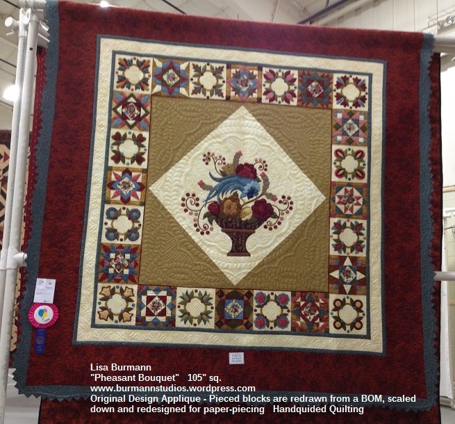 rzp5q5 Pheasant Bouquet - All applique and layout setting is original design The 12 pieced blocks were a BOM of Marti Mitchell blocks. I redrew them from 12" to 10" and altered them for paper-piecing Then center medallion is 50" square Almost 200 hours in constructing and quilting (50 hours handguided)