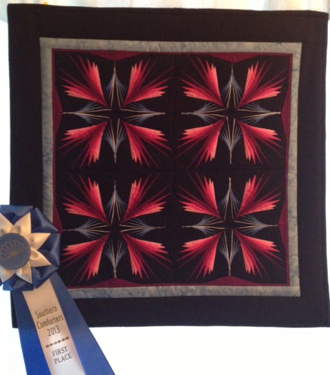 Breezy Fireworks - I took a class from George Sicilliano and have made two of his patterns. Loving detail this screamed "challenge" to me. 1000 pieces and quilt is 20" x 20" It is foundation pieced.