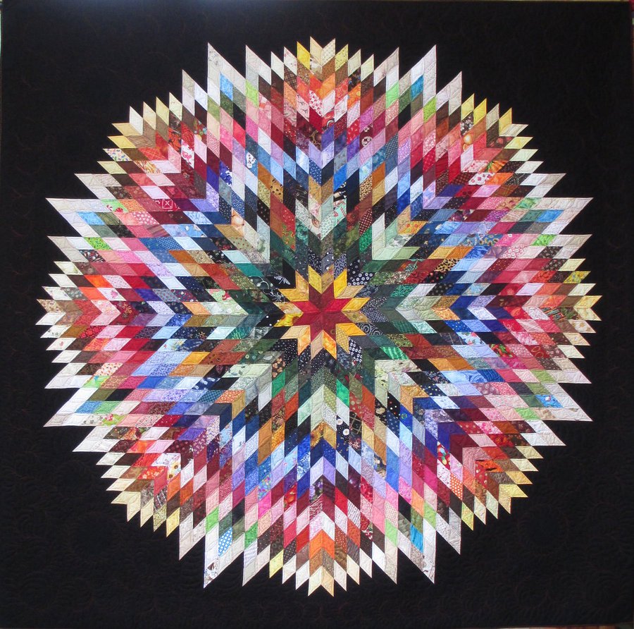 fortquilt One Thousand Diamonds - This is a modified Lone Star quilt with additional points. There are 1000 identically shaped and sized diamond patches each made of a different fabric making this a charm quilt. The fabrics were collected via a charm exchange within my local quilting group, The Lovells Loose Threads, in the township of Lovells, Michigan. I added some fabrics from my stash as well.