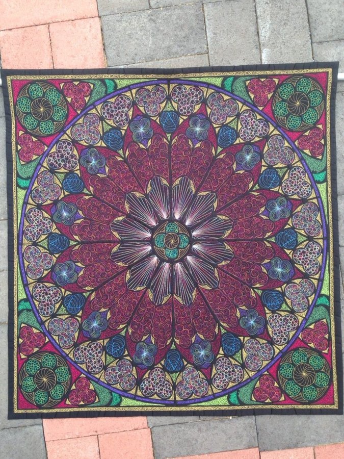 | Design Source - Description | This is a wholecloth quilt. I used black homespun and a 6" stencil of 1/4 of the Notre Dame that I enlarged. It is all freemotion stitched using Superior Threads magnifico and fantastico. |