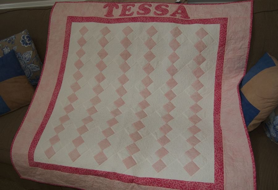 kimmquilt Tessa - This quilt was made to be a something that my niece could spread on the floor, carpet or grass so Tessa could play. I also wanted to try my first attempt at quilting it myself on my new Bernina 780. I use a wonderful Long Armer to do most of my quilts but I needed this fast and didn't want to wait. Tessa was fused and then double machine blanket stitched I printed out her name using different fonts and then enlarged the letters of the font I chose using Power Point.