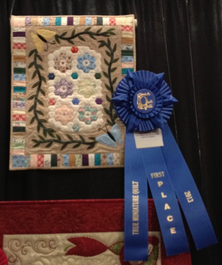 Sandansequilts Nana's Secret Garden - Hand paper-pieced hexes form the center "garden", surrounded by vines & butterflies. It includes paper-piecing, hand appliqué & machine quilting on my Janome 6600 home machine. This quilt was designed to showcase the center piece, which was handmade for my mother-in-law to be used in her antique doll house. After she passed away, I decided to incorporate it into a mini-quilt in her honor - "Nana's Secret Garden".