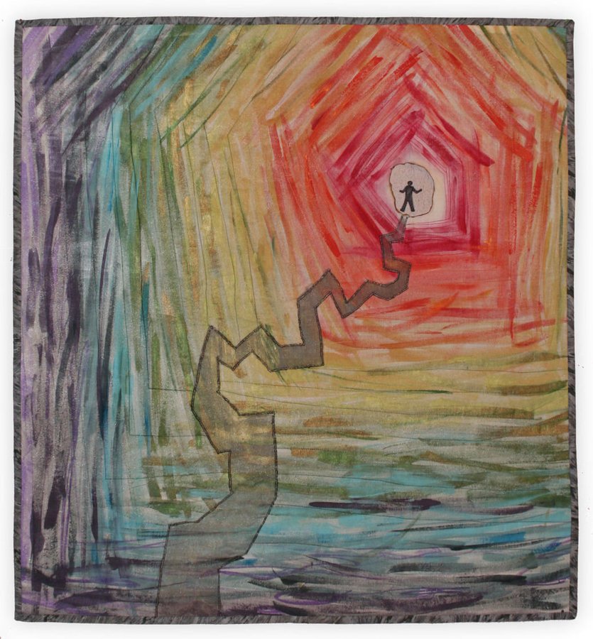 dianedidit The Crooked Path - This quilt was accepted into the AAQI Alzheimer's: Forgetting Piece by Piece show. Handpainted whole cloth background, echo quilted to the brush strokes. Path is organza, focal point is burned through the fabric.