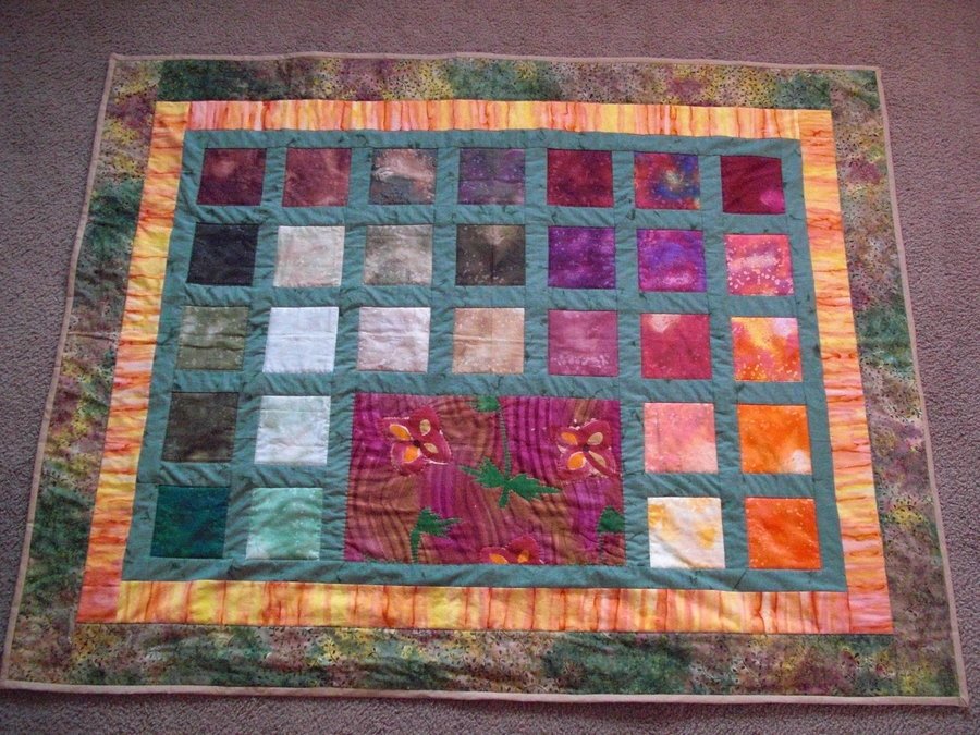 JustASouthernGirl Baby Batik - Friends expecting their first child wanted a non-traditional baby quilt in mainly greens and browns. I was stumped until I remembered the batiks I'd been collecting for a few years, and realized they would be the perfect choice. I started with the fabric appearing in the large block and incorporated all those colors. Rather than centering the focal fabric, I chose to set it in the middle of the lower row and create a color wash around it. I'd originally planned to use just the one border fabric in mottled green/brown/yellow, but it looked too blah next to the green sashing, so I added the yellow/orange/pink between to add a pop of color.