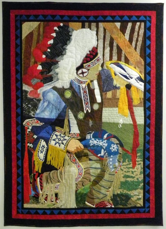 WandaM Koshare Indian Dancer - This quilt was made by 9 friends who met through thequiltshow.com! Cindy Neville, Carol Moellers, Dana Lynch, Mary Kay Runyan, Mary Holman, Hanne-Grete Brink, Karen Fitzpatrick, Bridget Lilja and Wanda Myers. The quilt was made from an original photo taken by a dear friend of the group.