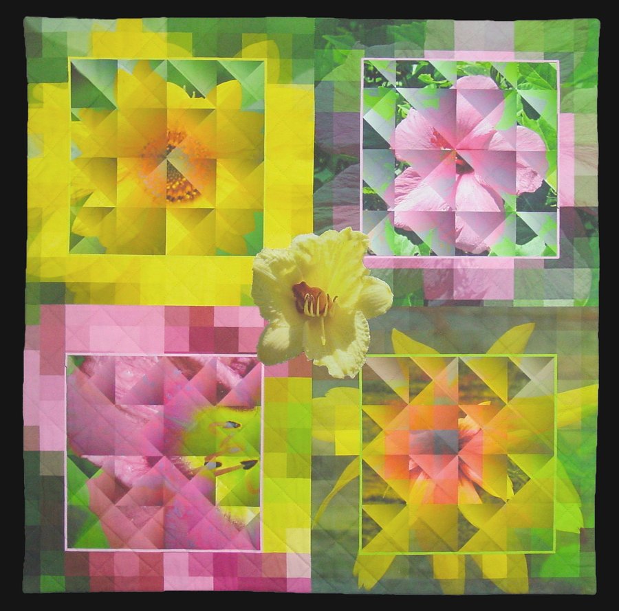 Deleted user. From The Garden 2 - I used my photos and manipulated them in PhotoShop Elements then printed them on fabric sheets. The center flower really did have the baby toad inside the center of the flower!! Quilted on a domestic Machine.