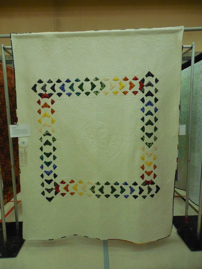 rbquilt Shimmer - This piecing of this quilt is my own design based off of permutations from the Drunkard Path. I wanted a border design where I wanted to show off the quilting. The quilting is machine non regulated and is an original design by Carol Selepec.