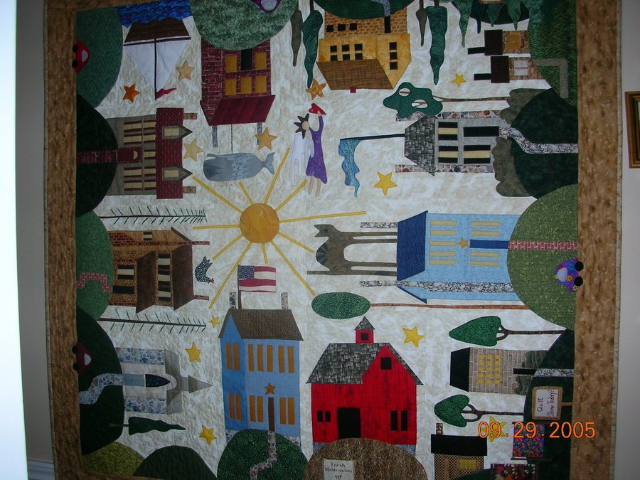 All Around the Town - A girlfriend and I got together every few months to make one or two blocks. We shared some fabrics and used our own fabrics, so our blocks are not identical. We both chose to fuse the pieces. I sent mine to a long armer because I wanted every tiny little piece stitched down. I estimate there are over a thousand pieces of fabric on this quilt top. Dianne did an excellent job securing them and quilting it attractively. The longer you look at it, the more you see, and it's rather entertaining.