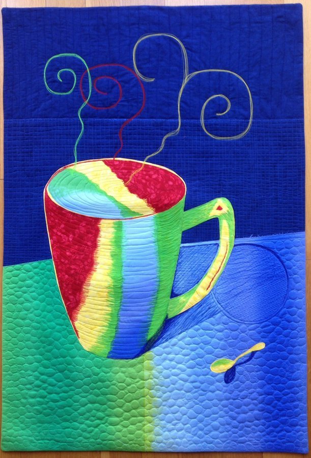 ljrussman "Coffee at 35,000 Feet" - Designed for SAQA's 'Redirecting the Ordinary' exhibit which will open at Houston IQF this autumn, this is an interpretation of my coffee cup on one of my many Air Canada flights!