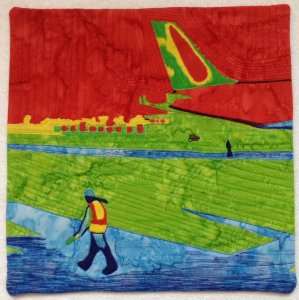 ljrussman "Early Morning at La Guardia" - This interpretation of a photo taken from my airplane window at an airport is for SAQA's annual auction. Done in this palette, the shapes of familiar objects appear somewhat mysterious and a very distant skyline twinkles!