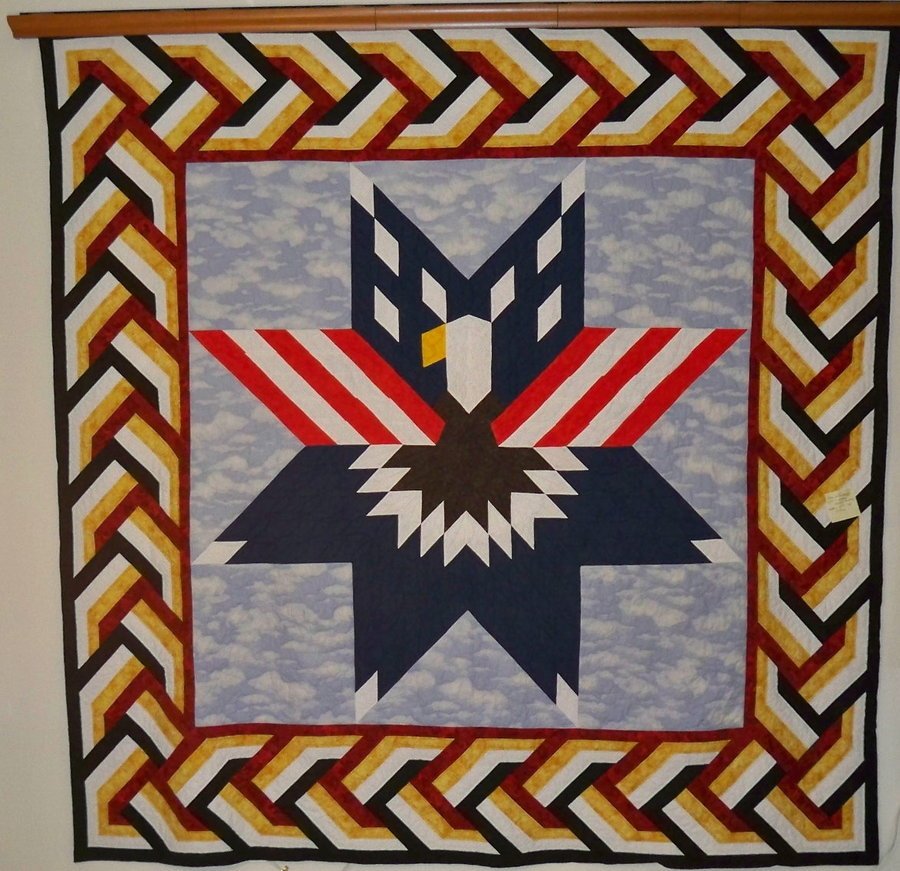 Nerak Also Honors - Adapted from T-Shirt bought at Little Bighorn Memorial. Border design by John Flynn. Jim Yellowhawk has given permission for use of this adaptation of "Also Rises" for the Quilts of Valor program, as long as he is credited on the label. I plan to re-make this quilt (minus the border) for my late husband, SGT Michael Boelter; to hang at this Air Force Reserve Unit, 96APS, Little Rock Air Station. Back to be his service ribbons.