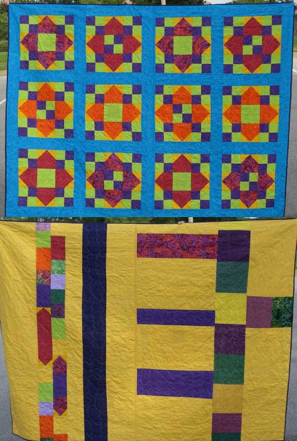 GeneBlack Happy Days Ahead - This picture shows both front and back of the quilt. This was a commission for a beloved granddaughter for a high school graduation gift. The colors are all her favorites. The back used extra pieces from the front along with yardage to make a modern design as an alternate to the "front" stars.