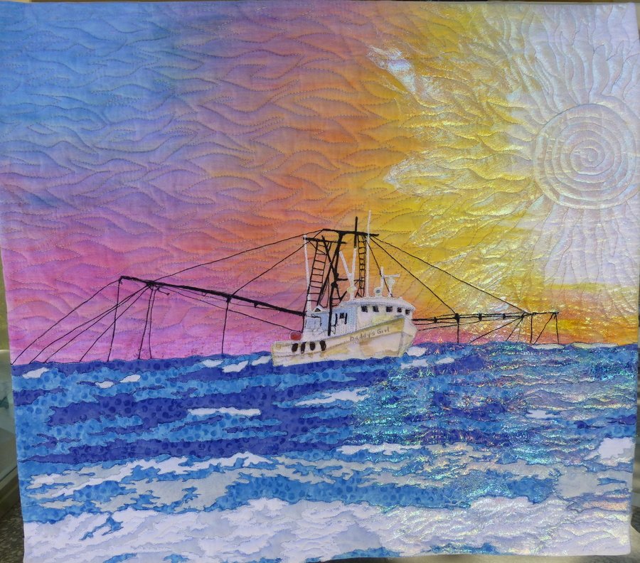 Pegonhiltonhead Daddy's Girl at Sunrise - This is my second quilt from a picture I took last year. The first was true to the original picture that was taken on an October afternoon. I decided to do a series from the picture. Using pictures that I took at sunrise from the same beach, I dyed the sky using Inktense chalk sticks and used Angelina to light up the sky and water. Yes it really does look like that.