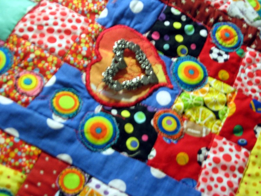 AuntJane Detail: The Circle of Life - This Quilt shows the ups & downs of life: The giraffe & the elephant's car crash. The puppy represents new life. The heart shaped broach represents Love. I collected "circle" fabric for a long time; slices of oranges & lemons, a variety of balls, and wheels.