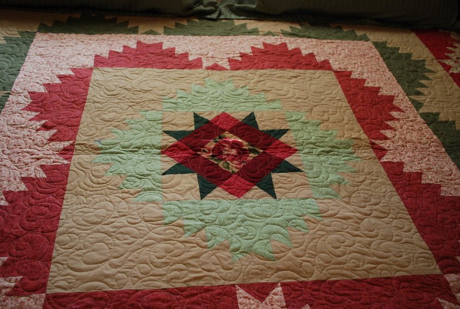 jmcemb Mountain Sunset - This was my first king sized quilt after I discovered quilting in 2005. I had it professionally quilted by Diane at Quilters Garden in Anaheim Ca. I used beige tone on tone for the backround fabric and Keepsake calico fabrics in greens and pink/burgandy for the mountains. I extended the drop approximately 3 inches more then the pattern called for.