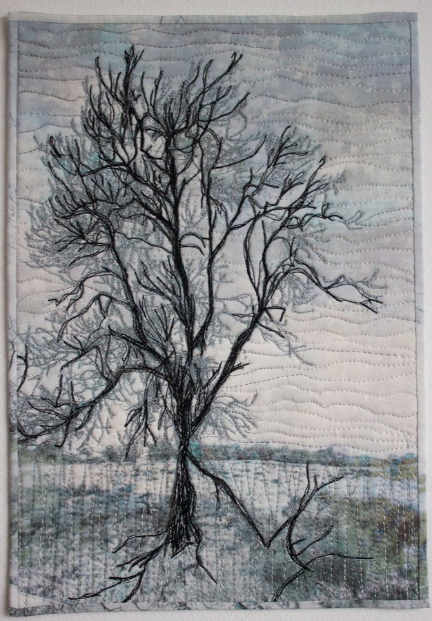 margaret5368 Waiting - Made for SAQA's Anniversary Trunk Show. Juried into the permanent collection of the National Quilt Museum, Paducah. Original photo layers with image of deconstructed screen printed fabric, printed on silk.