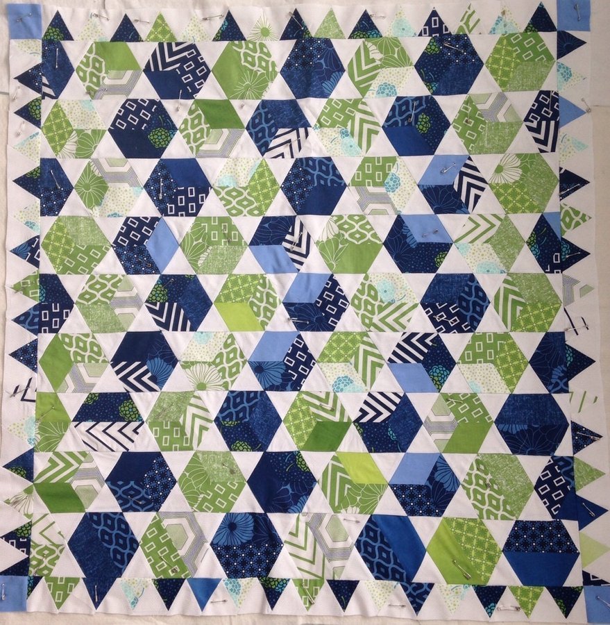 | Design Source - Description | Pieced hexies using 45 degree diamonds join with 30 degree triangles to make a fun 'building blocks' effect. I added a border of triangles. Used V & Company's Style Jelly Roll with KONA White background. |