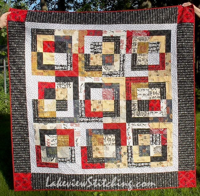 Monica33 Black, White and Read All Over - This quilt began as a quest to make a man's quilt without all the cliches of moose and fishes. Inspired by the recipient's interest in martial arts, all the fabrics are printed with some kind of kanji, either real or imaginary. Theoretically you could "read" the quilt, hence the title!