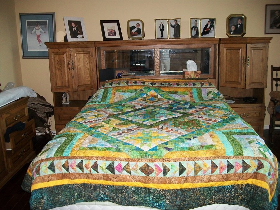 Isabellet. Block of the month - This was a my quilt that made be become a better quilter. I started this quilt in fall of 2012 and finished it in June of 2014 I chose my colors to cheer me up and make my bedroom a happy place. I used pure wool 1/2 inch batting and freemotioned quilted it on my Bernina 820.