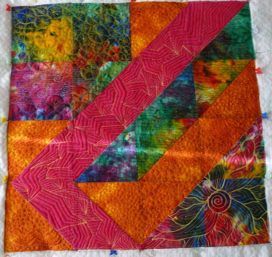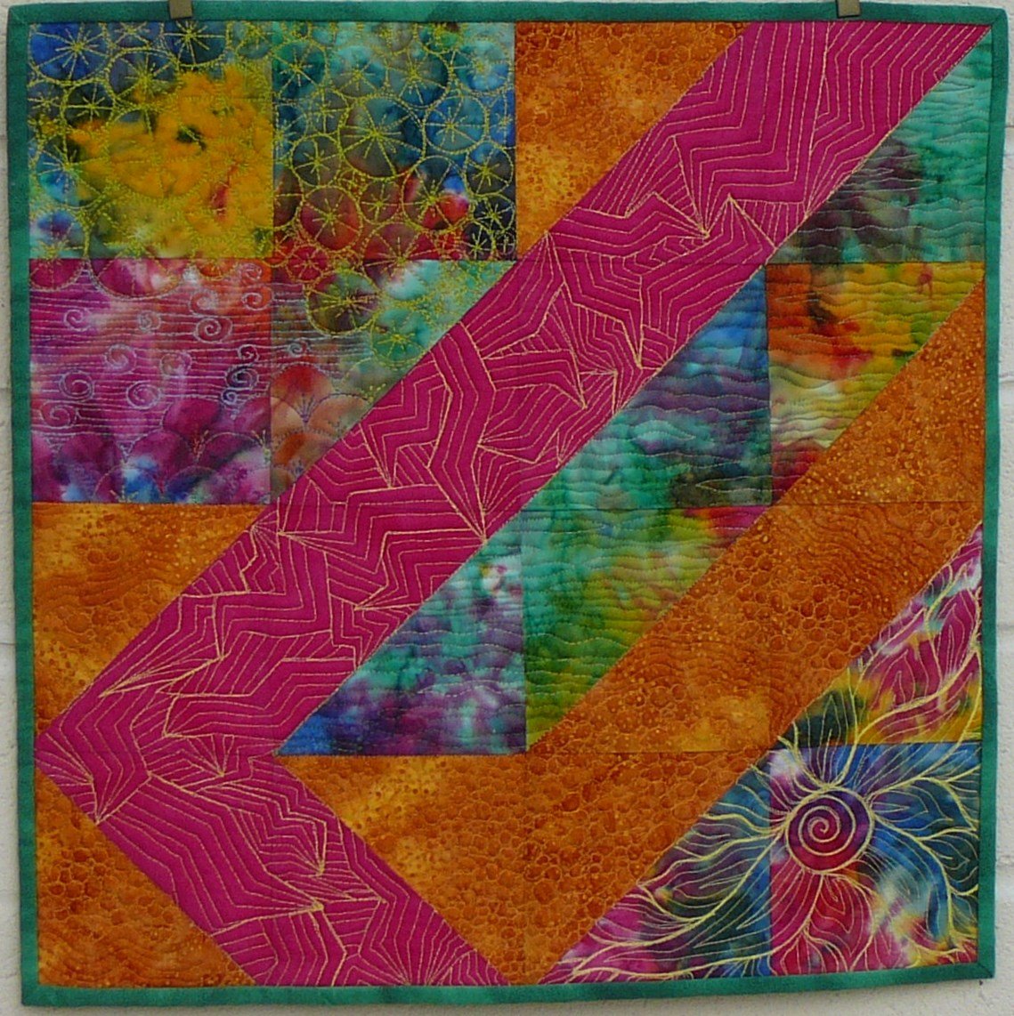 ANOTHER DAY IN PARADISE 2 - 2014 May "Another Day in Paradise 2": Left over half square triangles from other projects helped create the back drop for a combination of background fillers with free motion quilting designs from Leah Day's www.FreeMotionQuilting.com website. Overstitching increased tecture and accentuate design elements. Looking closely you will see a progression of designs incorporating stars, flowers, wind, lightening, earth with strata and pebbles and a large Flame Flower which was created by heavily overstitching for greater visability.