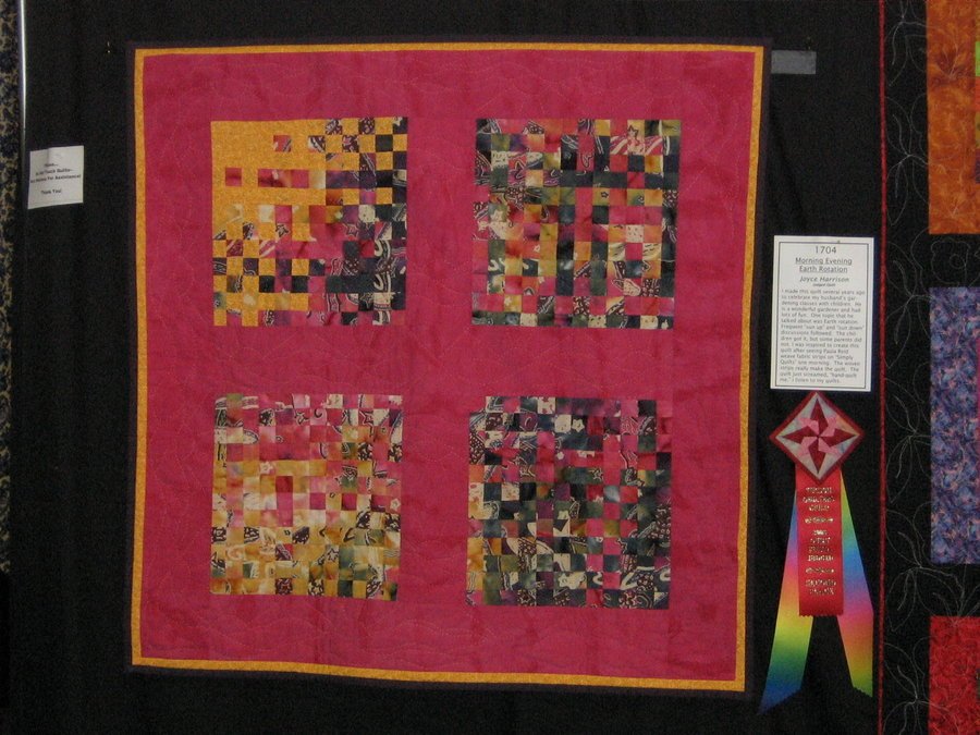 rjharrison1977 Morning Evening Earth Rotation - Batik fabric strips woven into 4 squares with sashing and border. Hand quilting in woven blocks as well as border.