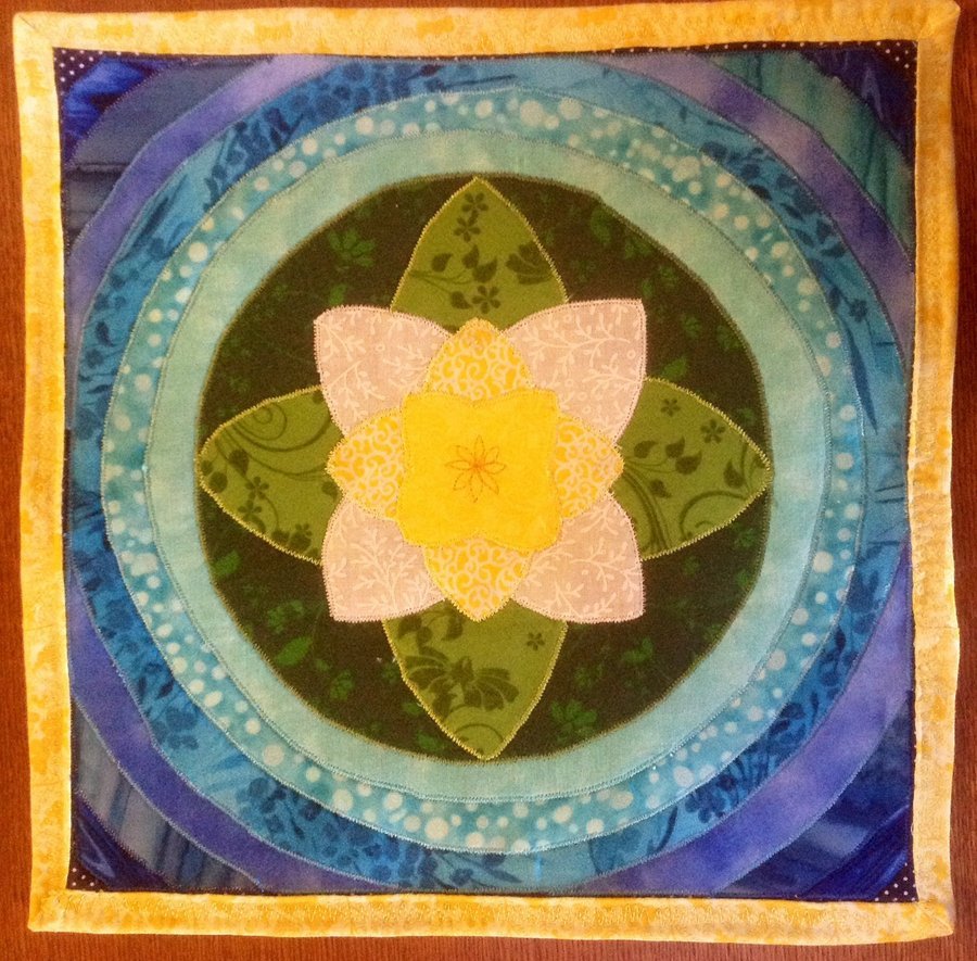 1MJ12 Lily pad - This fiber art quilt was made by my 13 yr. old granddaughter while visiting us at our lake home this summer. She loves to kayak and look at the blossoming lily pads. This was her first time to design her own project, choose the fabrics and free motion quilt.