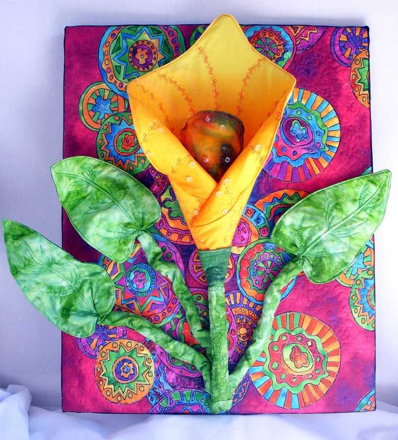 | Design Source - Description | 16" x 20" Three dimensional design of a lily done in yellow to orange ombre fabric. Background is a Ricky Timms colorful print fabric. |