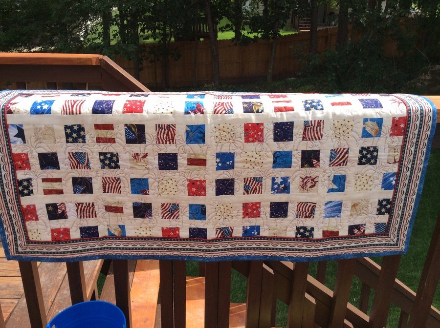 RMICHAP Celebration - I saw a picture of a table runner called Little Morsels, I liked the idea but thought that it could use some extra borders. I then digitized fireworks for the center quilting and around the edges I quilted the outline of the United States. My brother served in the Navy and felt he would like it, so,it was gifted to him.
