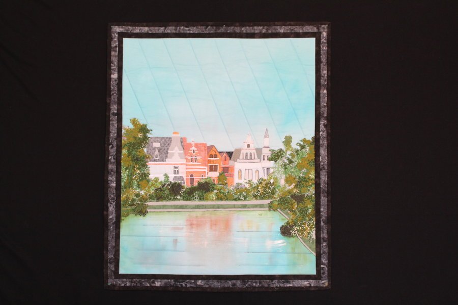 Angel9 Lake Louise - A photograph taken while visiting Brussels inspired this quilt. It is a combination of hand painted and commercial fabrics, all 100% cotton. The little houses were constructed separately and machine appliqued. I used fabric markers and oil pastel sticks for the accents. The reflections in the lake are smudged oil pastel sticks. Quilting was done on my domestic machine.