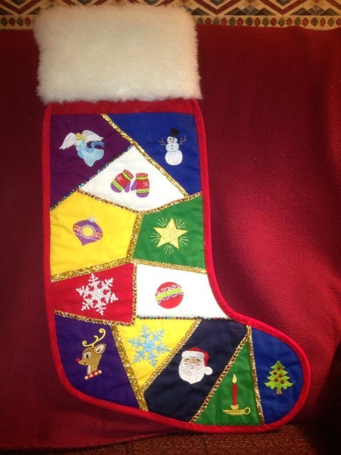 QuiltInPiece Lucy's Christmas Stocking - The stocking has 2 decorated sides: 1) crazy patch 2) Christmas tree. Embroidery by OESD