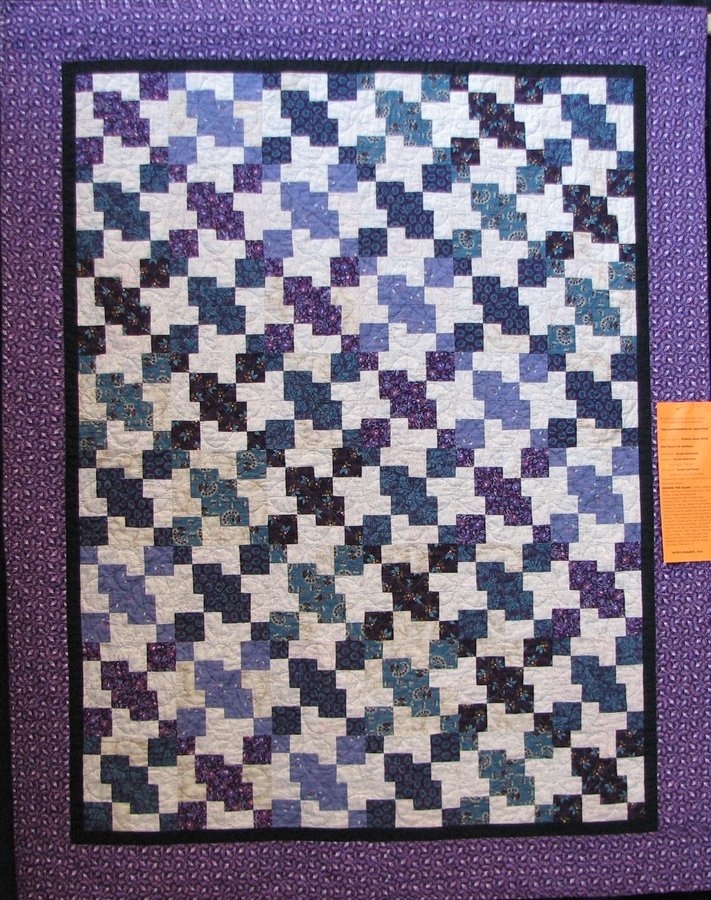 eeastman Purple Haze over the Strait of Georgia - Three friends and I quilted together for a few years, challenging and encouraging each other and having fun. One of our group suggested we all make this pattern (Strait of Georgia) from M'liss Rae Hawley's book More Fat Quarter Quilts and compare our different styles. The purples I used are from a packet I purchased in Sisters, and the white background is scrappy. I started the quilt when we were still a group, and finally finished it last year. I used silk batting and love the light weight and warmth, and the ease of hand quilting through it.